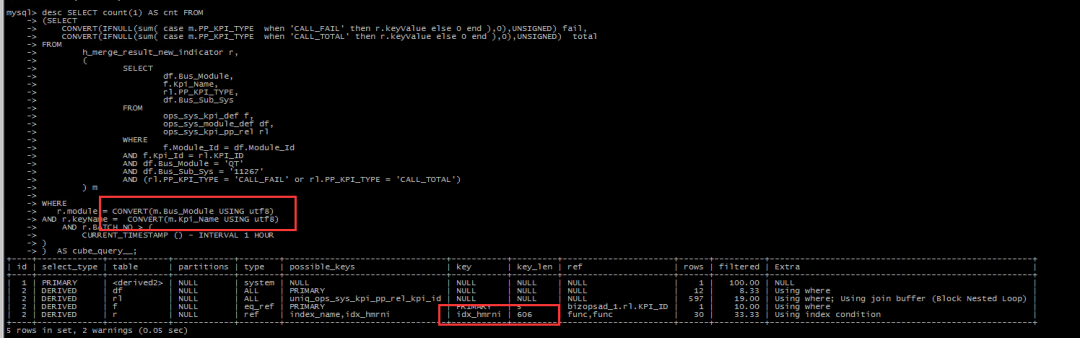 优化就只需要将字符集编码转为utf8再和h_merge_result_new_indicator关联就能用上索引: