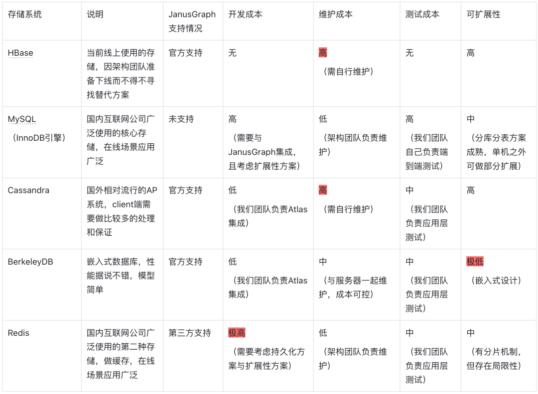 在设计上,JanusGraph 的存储后端是源码库可插拔的,只要做对应的适配即可,并且官方已经支持了一批存储系统。结合字节的技术栈以及我们的诉求,做了以下的评估。