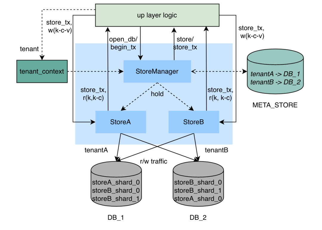 MysqlKcvTx:实现了AbstractStoreTransaction,对具体的 MySQL 连接进行了封装,负责和数据库的交互,它的commit和rollback方法由封装的 MySQL 连接真正完成。MysqlKcvStore:实现了KeyColumnValueStore,是具体执行读写操作的入口,每一个类型的 Store 对应一个MysqlKcvStore实例,MysqlKcvStore处理读写逻辑时,根据租户信息完全自主组装 SQL 语句,SQL 语句会由MysqlKcvTx真正执行。MysqlKcvStoreManager:实现了KeyColumnValueStoreManager,作为管理所有 MySQL 连接和租户的入口,也维护了所有 Store 和MysqlKcvStore对象的映射关系。在处理不同租户对不同 Store 的读写请求时,根据租户信息,创建MysqlKcvTx对象,并将其分配给对应的MysqlKcvStore去执行。 复制public class MysqlKcvStoreManager implements KeyColumnValueStoreManager {@Override