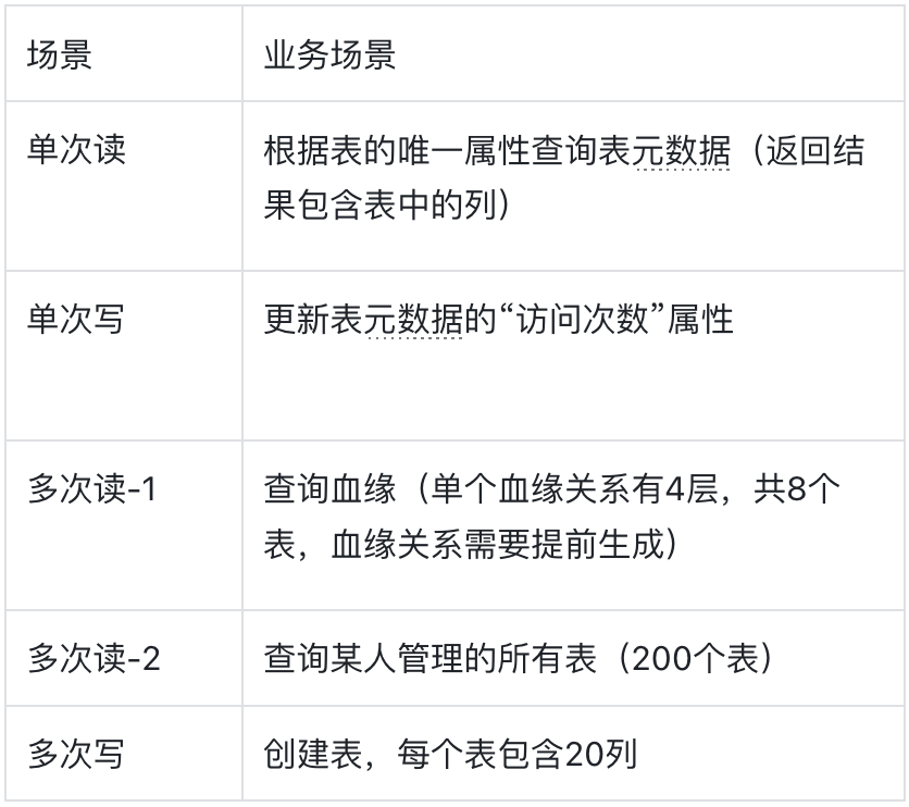 模拟单租户表单分片情况下,库表元数据创建、更新、查询,表之间血缘关系的创建、查询,以此反映在图库单次读写和多次读写情况下 MySQL 的表现。