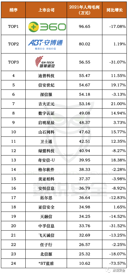 国内上市网安企业2021年的络安人均绩效和人均薪酬情况是怎样的呢?我们来看数据。注:本文数据基于各公司2021年度财报、司平Wind(万德数据库)整理。均薪