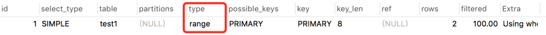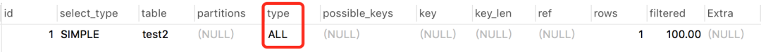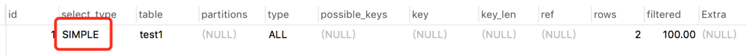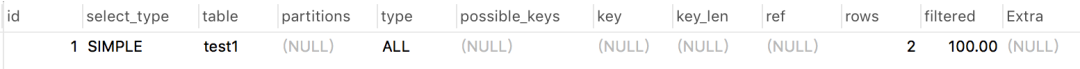 SIMPLE执行sql如下: 复制explain select * from test1;1.结果:
