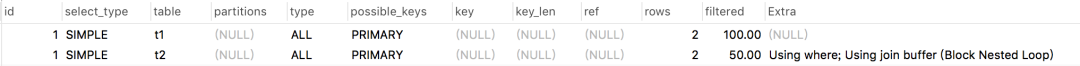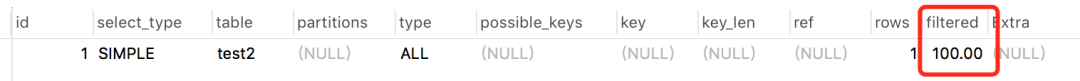 rows显示了检查的估计行数,rows× filtered显示了与下表连接的行数。例如,如果 rows为1000且 filtered为50.00(50%),则与下表连接的行数为1000×50%= 500。