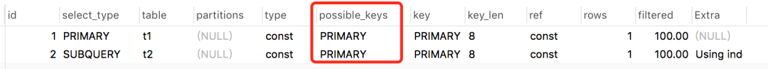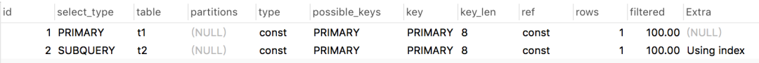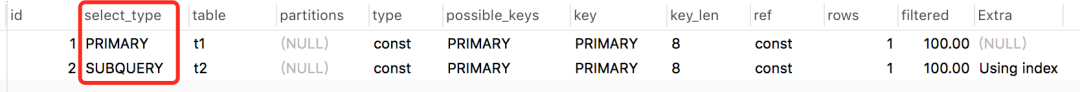 我们看到这条嵌套查询的sql中,最外层的t1表是PRIMARY类型,而最里面的子查询t2表是SUBQUERY类型。