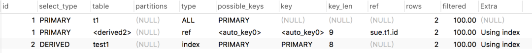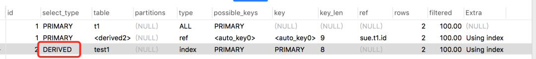 DERIVED执行sql如下: 复制explain select t1.* from test1 t1 inner join (select max(id) mid from test1 group by id) t2 on t1.id=t2.mid1.2.3.4.结果: