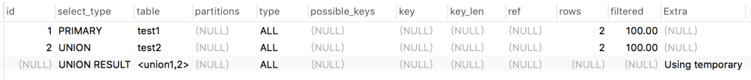 test2表是UNION关键字之后的查询,所以被标记为UNION,test1是最主要的表,被标记为PRIMARY。而<union1,2>表示id=1和id=2的表union,其结果被标记为UNION RESULT。