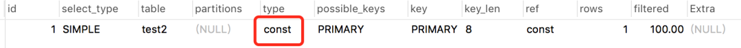 system这种类型要求数据库表中只有一条数据,是const类型的一个特例,一般情况下是不会出现的。const通过一次索引就能找到数据,一般用于主键或唯一索引作为条件的查询sql中,执行sql如下: 复制explain select * from test2 where id=1;1.结果: