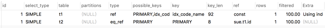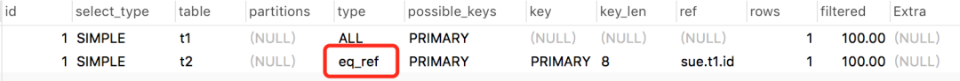 我们看到表t1命中的索引是const(常量),而t2命中的索引是列sue库的t1表的id字段。