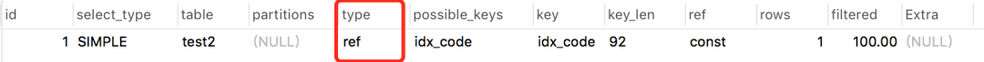 ref常用于非主键和唯一索引扫描。执行sql如下: 复制explain select * from test2 where code = 001;1.结果:
