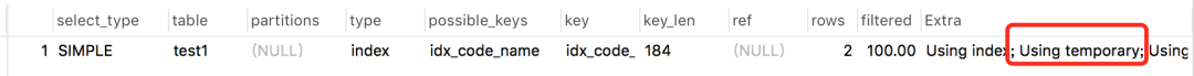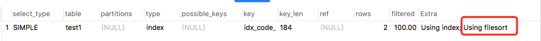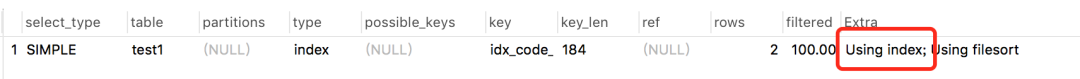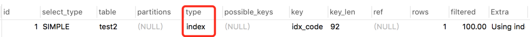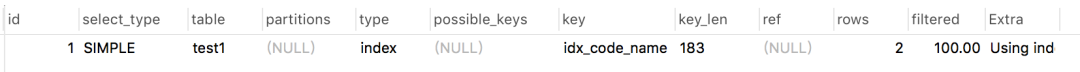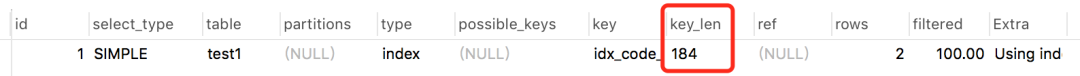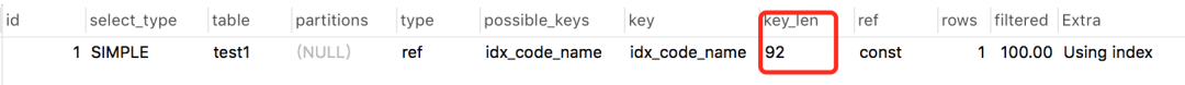 上图中使用了联合索引:idx_code_name,如果索引全匹配key_len应该是183,但实际上却是92,这就说明没有使用所有的索引,索引使用不充分。