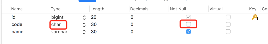 此外,如果字段类型允许为空则加1个字节。上图中的 184是怎么算的?184 = 30 * 3 + 2 + 30 * 3 + 2再把test1表的code字段类型改成char,并且改成允许为空: