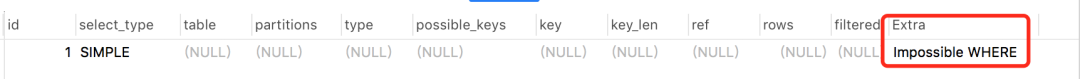 Impossible WHERE表示WHERE后面的条件一直都是false,执行sql如下: 复制explain select code from test1 where a = b;1.结果: