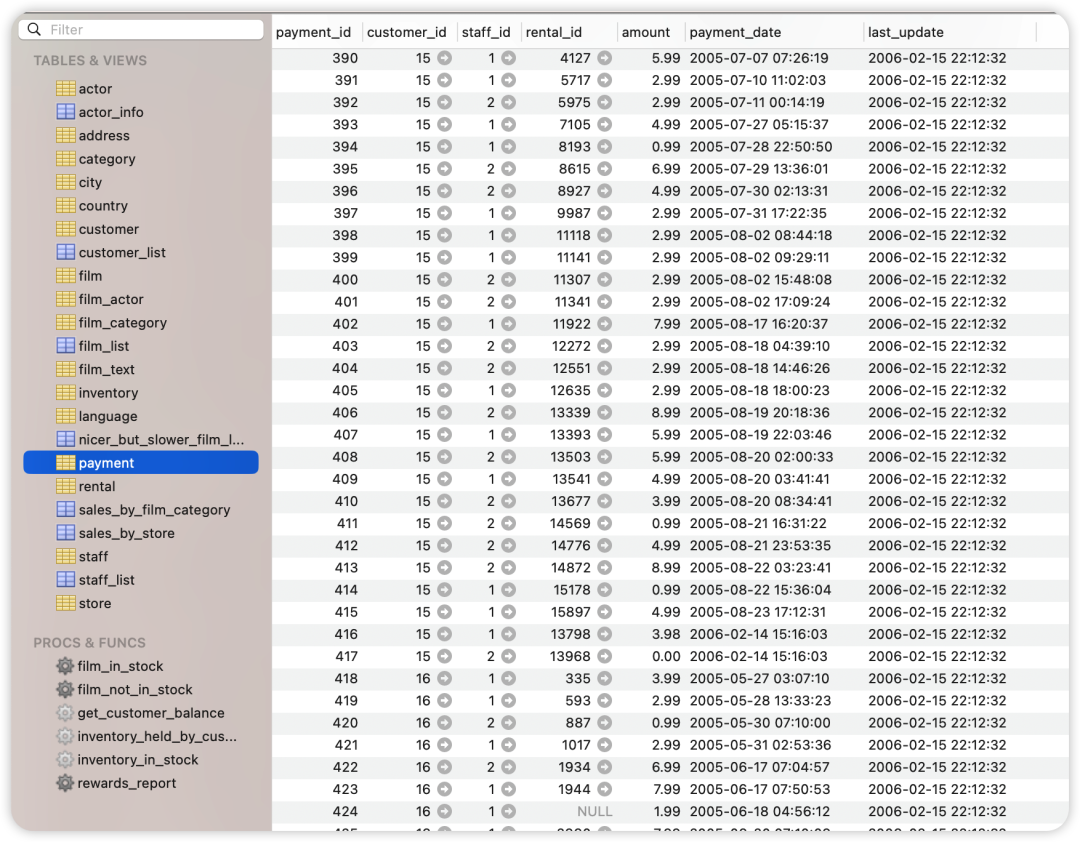 在 MySQL 的官方案例中,有一个支付表 payment,如下图: