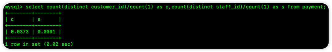 复制select count(distinct customer_id)/count(1) as c,count(distinct staff_id)/count(1) as s from payment;1.执行结果如下: