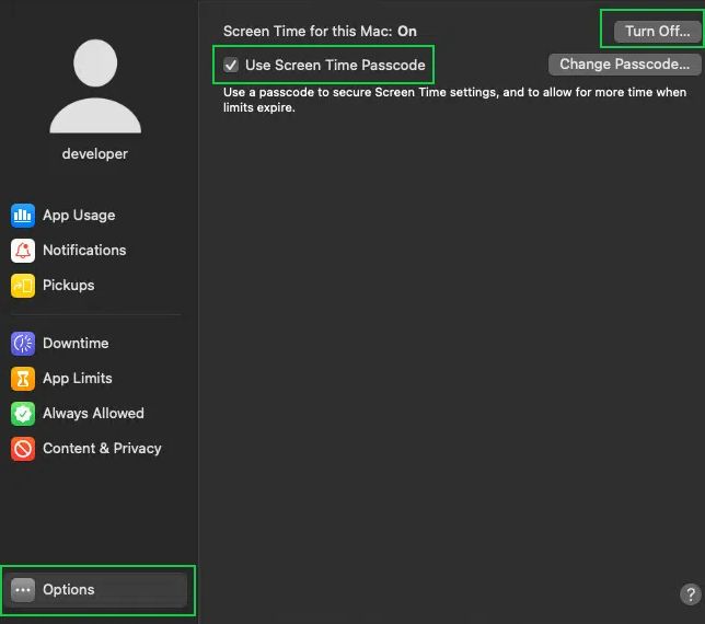 您可以通过登录新帐户并在“系统偏好设置”中打开“屏幕时间”窗格来限制用户屏幕时间。然后,选择选项并打开该功能。下一步是启用“使用屏幕时间密码”。时间密码是忽略屏幕时间限制或更改屏幕时间设置所需的四位数代码。