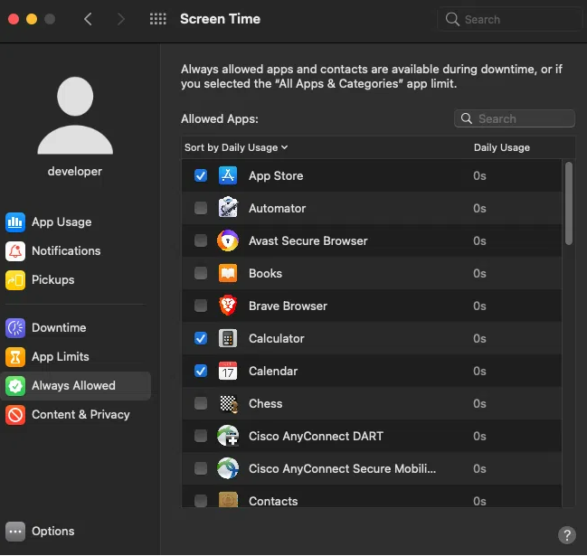 macOS 管理员可以通过配置屏幕时间限制来限制用户对某些应用程序的访问。此功能允许配置计算机停机时间、应用程序限制以及内容和隐私限制。开发应用程序时,请确保您了解此功能的工作原理以及您的应用程序在屏幕时间限制下应如何运行。