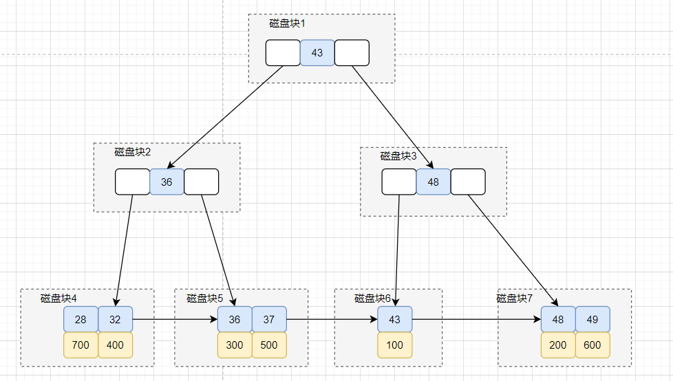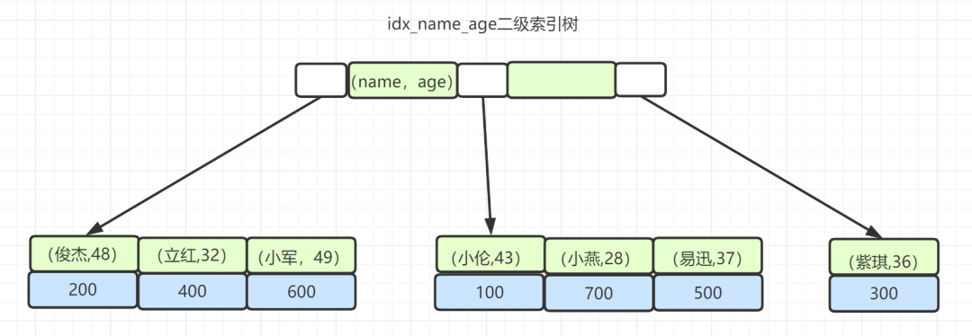 ) ENGINE=InnoDB DEFAULT CHARSET=utf8;insert into employee values(100,小伦,43,2021-01-20,0);insert into employee values(200,俊杰,48,2021-01-21,0);insert into employee values(300,紫琪,36,2020-01-21,1);insert into employee values(400,立红,32,2020-01-21,0);insert into employee values(500,易迅,37,2020-01-21,1);insert into employee values(600,小军,49,2021-01-21,0);insert into employee values(700,小燕,28,2021-01-21,1);1.2.3.4.5.6.7.8.9.10.11.12.13.14.15.16.17.执行这条查询SQL,需要执行几次的树搜索操作?可以画下对应的索引树结构图~