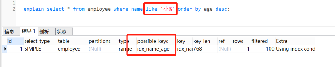 这个SQL: select * from employee where name like 小% order by age desc; 也是命中索引的。