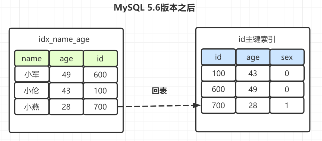如果是Mysql5.6之前,在idx_name_age索引树,找出所有名字第一个字是“小”的人,拿到它们的主键id,然后回表找出数据行,再去对比年龄和性别等其他字段。如图: