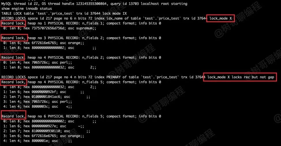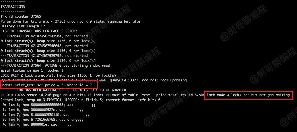 复制begin;select * from price_test where price >= 30 for update;1.2.执行 show engine innodb status\G; 查看锁信息如下图所示。