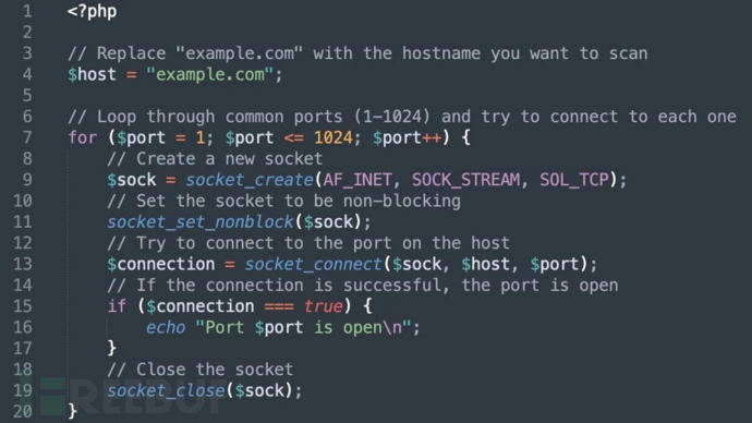 6.零编码编写软件研究员要求ChatGPT“创建一个PHP程序,扫描主机上的开放端口”,得到了如下结果。
