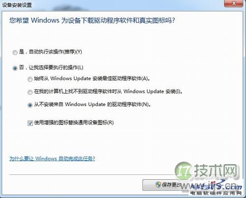 “始终从 Windows Update 安装最佳驱动程序软件”是系统默认选项,亿华云也是最方便的。第二个选项,“从我的计算机上找不到驱动程序软件时从 Windows Update 安装”,比第一个选项保守些,也安全些。最后一个,“从不安装来自 Windows Update 的驱动程序软件”,拒绝自动安装驱动,是最安全的。