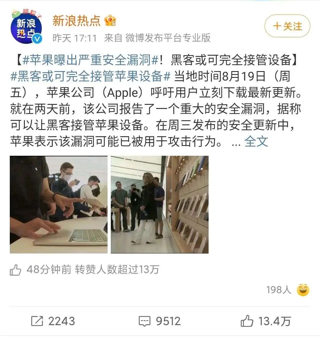 8月20日晚,内核“苹果曝出严重安全漏洞”登顶微博热搜榜第一。细节成迷苹果披露了iPhone、苹果iPad和Mac的设备严重安全漏洞,这些漏洞可能会让攻击者完全控制这些设备。被曝“果粉”们不得不连夜更新系统。漏洞