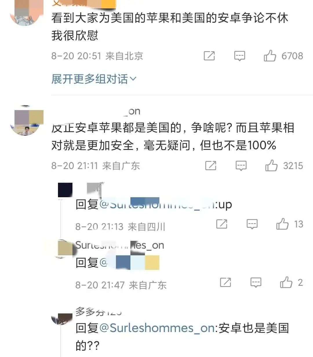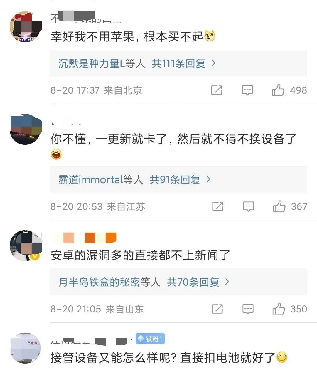 当然,面对苹果如此大的漏洞,“果粉”与“安卓”粉也有掐架的迹象。既然没有绝对的安全,那么到底哪个更安全呢?这个问题好像没那么好回答。还好,网友们也很清醒:反正都不是咱自研的,争啥呢?