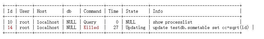 update testdb.sometable set cc=sqrt(id)1.2.3.4.该示例显示了如果一个线程被标记为kill或query end,并且 InnoDB 引擎状态报告同一线程的回滚,请等待它结束。
