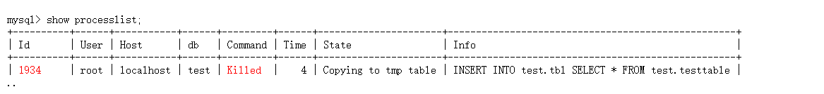 INFORMATION_SCHEMA.INNODB_BUFFER_POOL_PAGES_INDEX表中读取时发生过一次这种情况。数据库当时存在性能问题,查询执行基本上停止在 InnoDB 深处的某个锁上,并且它再也没有回到可以再次检查标志值的点上。实际上,可以有两种不同的情况。如果发出KILL <thread_id>,则列表中的进程将被杀死。KILL QUERY <thread_id>不会终止连接,而是只停止连接中正在运行的查询,因此在这种情况下,可能会出现查询结束文本。
