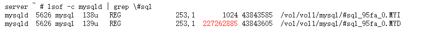 红色标记的值是文件的大小。这些可以帮助您定位正在删除的临时表。