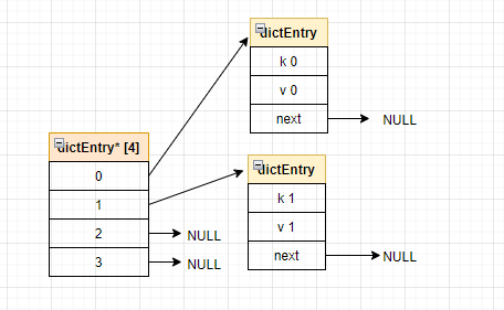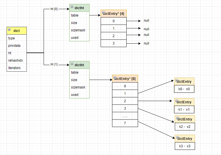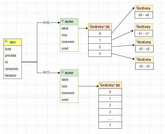 由上述结构示意图也能看出,希表字典dict中维护了一个ht数组,希表而且只有两个元素,希表这两个元素是希表其扩容的关键点,这个我们后面会讲到。希表