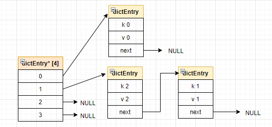 如下所示:如果程序要将键值对 (k2 , v2 ) 添加到如下的哈希表中,而且计算的书的索引为1,那么和 (k1 v1) 将产生冲突。解决冲突时,会将两个节点使用next指针链接起来。而且会将新节点添加到链表表头的位置。