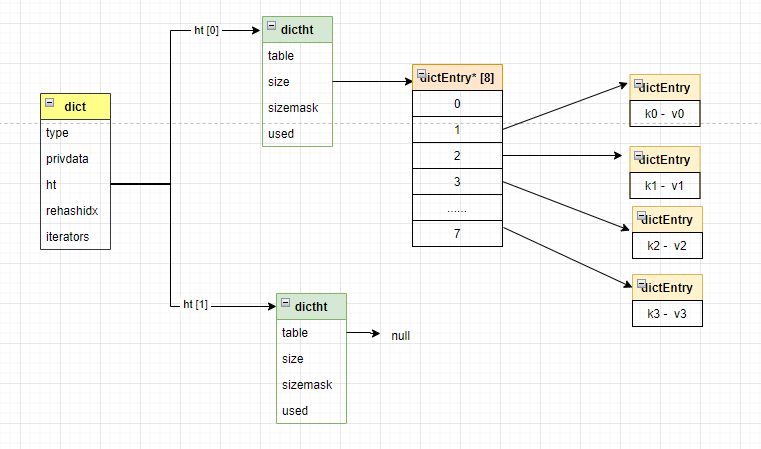 执行扩展操作时会将字典中的ht[1] 哈希表大小设置成第一个大于等于ht[0] 的ht[0].used * 2的 2^n (2的n次幂)。将保存早ht[0] 中的所有的键值对 rehash到ht[1] 上, rehash过程中会重新计算哈希值和索引值。当ht[0]中所有的键值对都迁移到ht[1]上时,释放ht[0], 并将ht[1] 设置成 ht[0], 并在ht[1]上建一个空的哈希表。将下图中的字典做rehash操作: