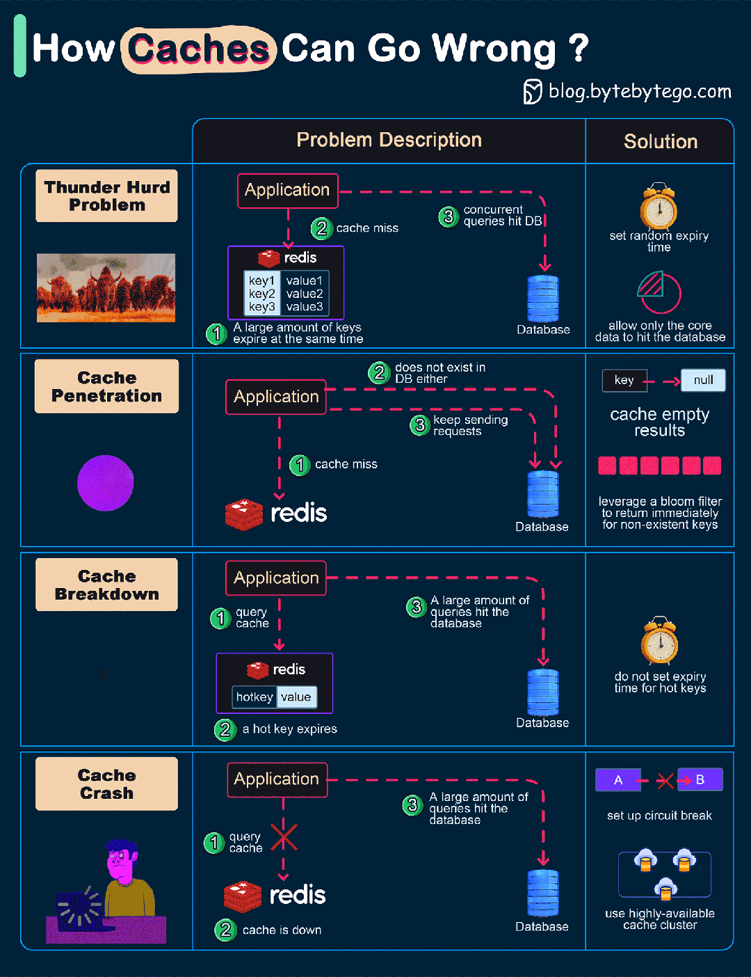 下图显示了缓存可能出错的 4 种典型情况及其解决方案。