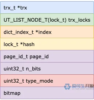 lock_t 中,行锁结构使用 trx、trx_locks、index、hash、type_mode 五个属性,加上 lock_rec_t 的 page_id、n_bits 两个属性,外加行锁结构最后外挂了一块没有属性名的内存区域(我们暂且命名为 bitmap),就是行锁的整体结构了。