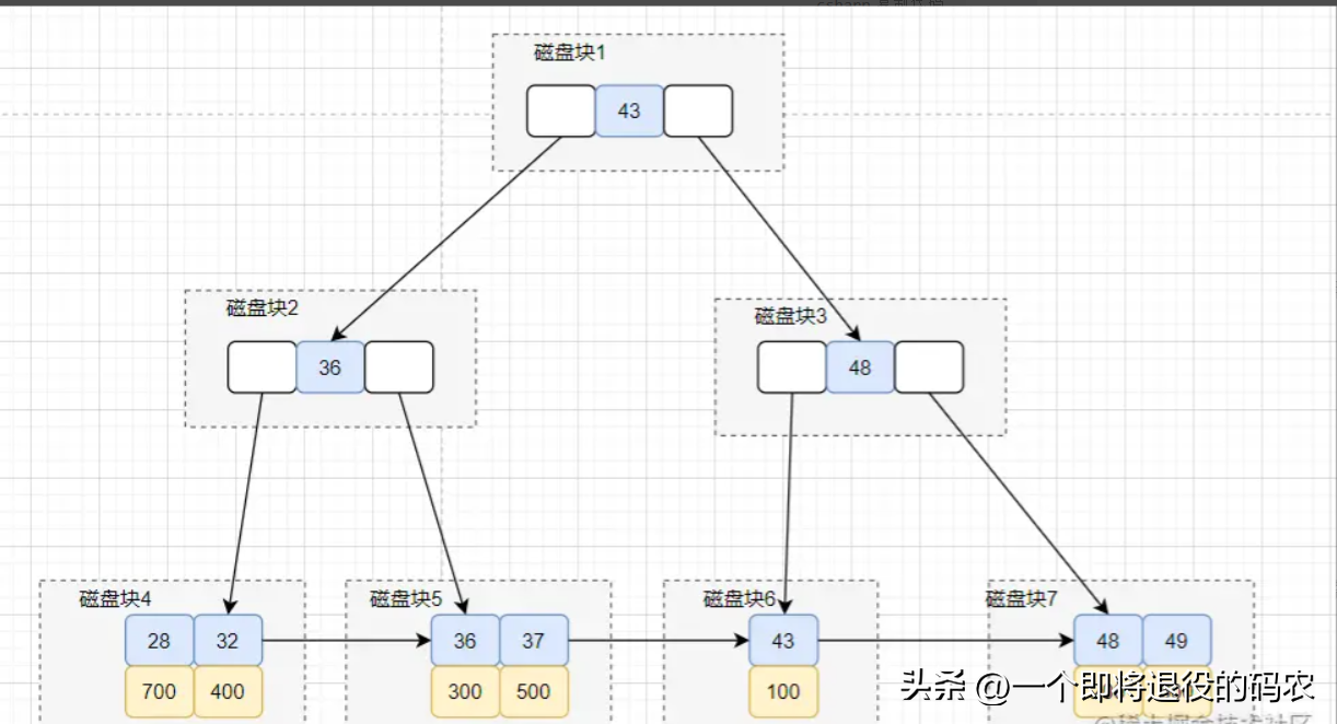 复制CREATE TABLE `employee` ( `id` int(11) NOT NULL, `name` varchar(255) DEFAULT NULL, `age` int(11) DEFAULT NULL, `date` datetime DEFAULT NULL, `sex` int(1) DEFAULT NULL, PRIMARY KEY (`id`), KEY `idx_age` (`age`) USING BTREE ) ENGINE=InnoDB DEFAULT CHARSET=utf8; insert into employee values(100,小伦,43,2021-01-20,0); insert into employee values(200,俊杰,48,2021-01-21,0); insert into employee values(300,紫琪,36,2020-01-21,1); insert into employee values(400,立红,32,2020-01-21,0); insert into employee values(500,易迅,37,2020-01-21,1); insert into employee values(600,小军,49,2021-01-21,0); insert into employee values(700,小燕,28,2021-01-21,1);1.2.3.4.5.6.7.8.9.10.11.12.13.14.15.16.17.执行这条查询SQL,需要执行几次的树搜索操作?可以画下对应的索引树结构图~