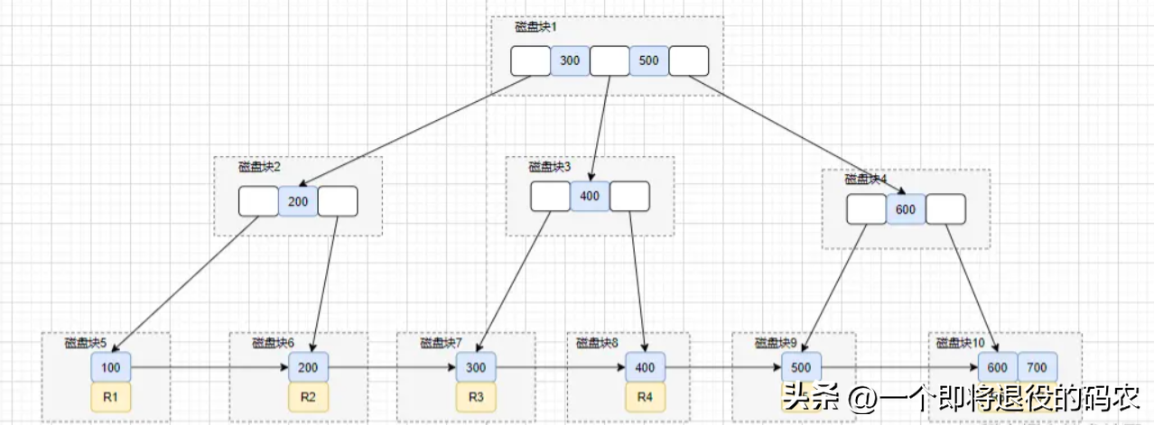 搜索idx_age 索引树,将磁盘块1加载到内存,由于32<43,搜索左路分支,到磁盘寻址磁盘块2。将磁盘块2加载到内存中,由于32<36,搜索左路分支,到磁盘寻址磁盘块4。将磁盘块4加载到内存中,在内存继续遍历,找到age=32的记录,取得id = 400.拿到id=400后,回到id主键索引树。搜索id主键索引树,将磁盘块1加载到内存,因为300<400<500,所以在选择中间分支,到磁盘寻址磁盘块3。虽然在磁盘块3,找到了id=400,但是它不是叶子节点,所以会继续往下找。 到磁盘寻址磁盘块8。将磁盘块8加载内存,在内存遍历,找到id=400的记录,拿到R4这一行的数据,好的,大功告成。当查询的数据在索引树中,找不到的时候,需要回到主键索引树中去获取,这个过程叫做回表。