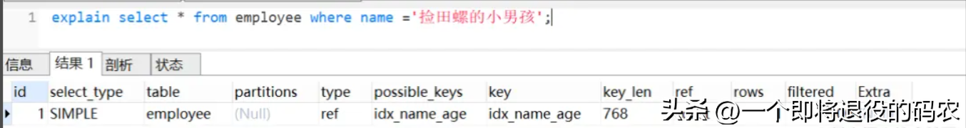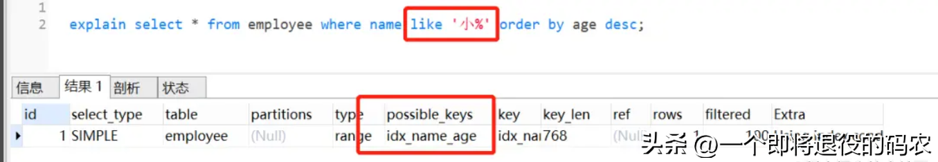 复制select * from employee where name like 小% and age=28 and sex=0;1.其中,name和age为联合索引(idx_name_age)。