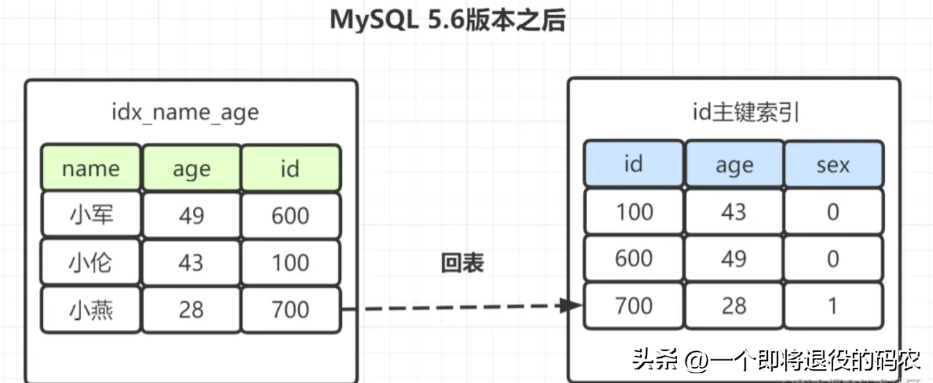 如果是Mysql5.6之前,在idx_name_age索引树,找出所有名字第一个字是“小”的人,拿到它们的主键id,然后回表找出数据行,再去对比年龄和性别等其他字段。如图: