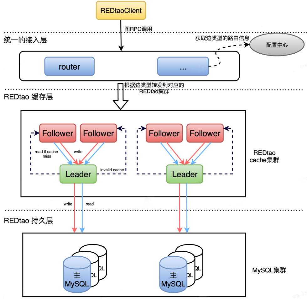 整体架构分为三层:接入层、缓存层和持久层。业务方通过 REDtao SDK 接入服务。如下图: