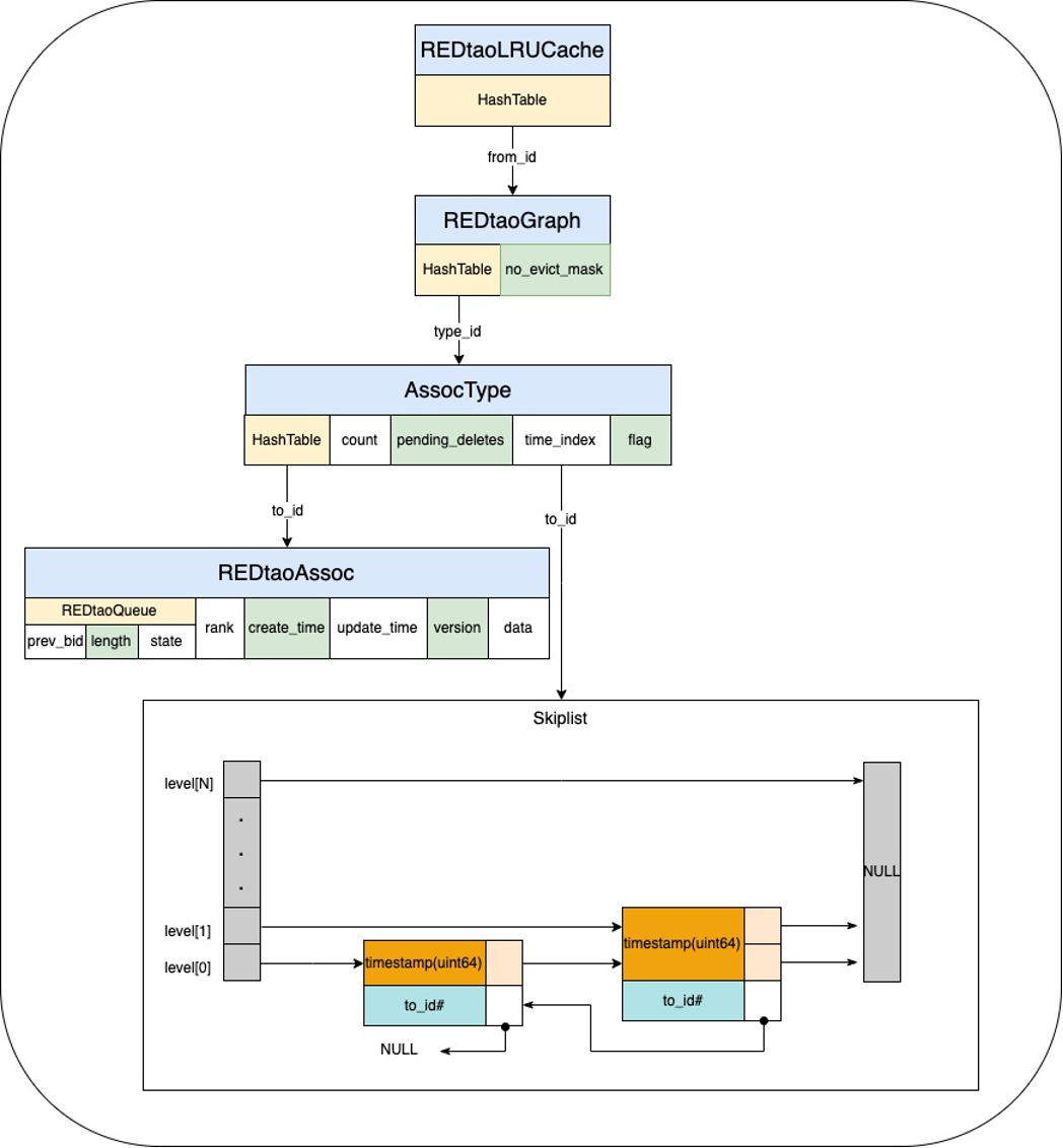 3.3 极致性能数据结构的设计是 REDtao 高性能的重要保证。我们采用了三层嵌套 HashTable 的设计, 通过根据某个起点 from_id 从第一级 HashTable 中查找到 REDtaoGraph,记录了所有 type 下对应的所有的出边信息。接着,在第二级 HashTable 中,根据某个 type_id 查找到 AssocType 对应某个 type 下边所有出边的计数、索引以及其他元数据。最终在最后一级 HashTable ,通过 AssocType 的某个 to_id 查找到最终边信息。我们记录了创建时间、更新时间、版本、数据以及 REDtaoQueue,time_index 则对应根据创建时间排序列表。最后一级 HashTable 以及索引限制存储最新的 1000 个边信息,以限制超级点占据过多内存,同时集中提高最新热数据的查询命中率以及效率。REDtaoQueue 用于排队当前某个关系的读写,只记录了当前最后一个请求的元数据。每次查询或写入时,首先查询 REDtaoAssoc,若缓存不存在,则会首先创建只包含 REDtaoQueue 的对象;若缓存已存在,则会更新队列元数据,将自己设置为队列的最后一个请求,并挂起等待被执行。