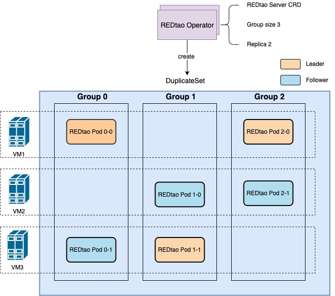 随着 Kubernetes 云原生技术越来越成熟,我们也在思考如何利用 k8s 的能力将部署和虚拟机解绑,进一步云原生化,方便在不同的云厂商之间部署和迁移。REDtao 实现了一个运行在 Kubernetes 集群上的 Operator,以实现更快的部署、扩容和坏机替换。为了让 k8s 能感知集群分片的分配并且控制同一分片下的 Pods 调度在不同宿主机上,集群分组分片分配由 k8s Operator 渲染并控制创建 DuplicateSet (小红书自研 k8s 资源对象)。REDtao 则会创建主从并根据 Operator 渲染出来的分片信息创建集群,单个 Pod 故障重启会重新加入集群,无需重新创建整个集群。集群升级时,Operator 通过感知主从分配控制先从后主的顺序,按照分片分配的顺序滚动升级以减少升级期间线上影响。