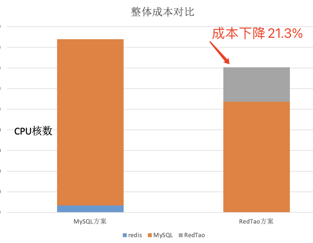 我们的社交图谱数据访问中,90% 以上的请求都是读请求,并且社交图谱的数据有非常强的时间局部性(即最近更新的数据最容易被访问)。REDtao 上线后,获得 90% 以上的 cache 命中率, 对MySQL 的 QPS 降低了 70%+ ,大大降低了 MySQL 的 CPU 使用率。在缩容 MySQL 的副本数目后,整体成本降低了21.3%。