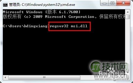 在命令行窗口输入“regsvr32 msi.dll”,回车,提示“DllRegisterServer在msi.dll已成功”,并“确定”退出。
