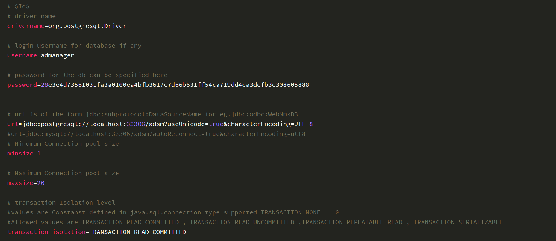 配置文件路径:C:\Program Files\ManageEngine\ADManager Plus\conf\database_params.conf,内容示例: