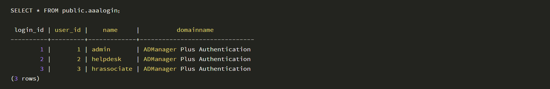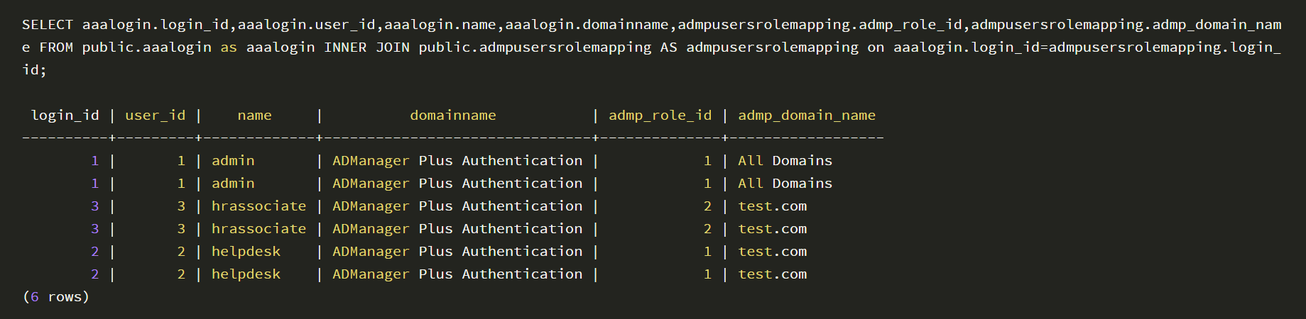 拼接出数据库的试环连接命令:"C:\Program Files\ManageEngine\ADManager Plus\pgsql\bin\psql" "host=127.0.0.1 port=33306 dbname=adsm user=admanager password=DFVpXge0NS"