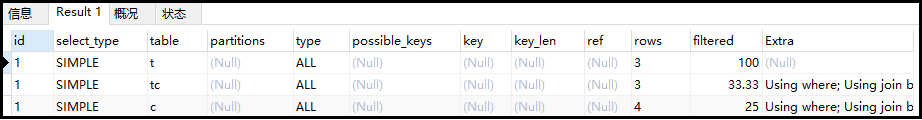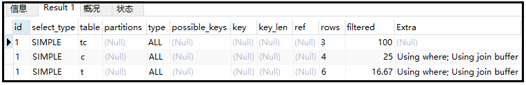 复制explain select * from course c,teacher t where c.tid = t.tid and t.tname = tz ;1.2.3.4.结果如下: