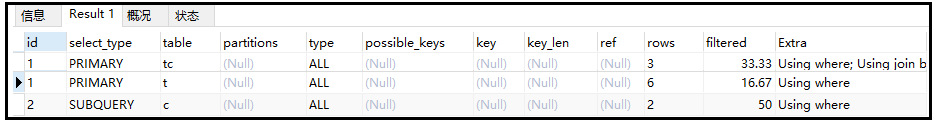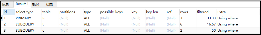 ② 案例:查询教授SQL课程的老师的描述(desc) 复制# 查看执行计划 explain select tc.tcdesc from teacherCard tc where tc.tcid = ( select t.tcid from teacher t where t.tid = (select c.tid from course c where c.cname = sql) );1.2.3.4.5.6.7.8.结果如下: